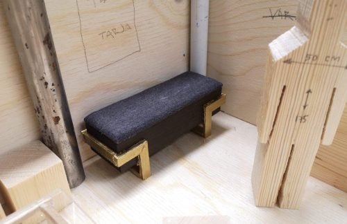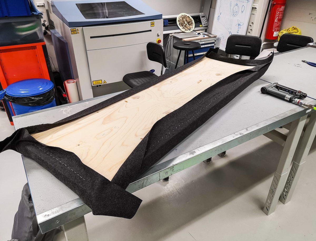 Maalattuja teräsosia odotettaessa jatkettiin istuimen parissa. 18 mm vanerinen pohjalevy leikattiin mittaan, siihen asennettiin vaahtomuovi ja se verhoiltiin tummanharmaalla palosuojatulla kankaalla. Istuimen kiinnitys runkoon tehtiin kulmaraudoilla ja ruuveilla.