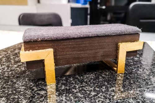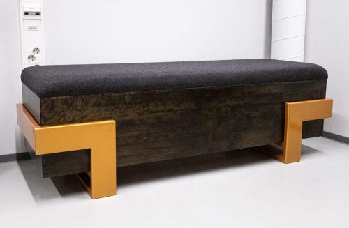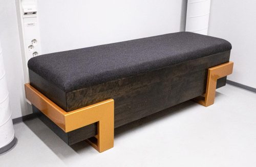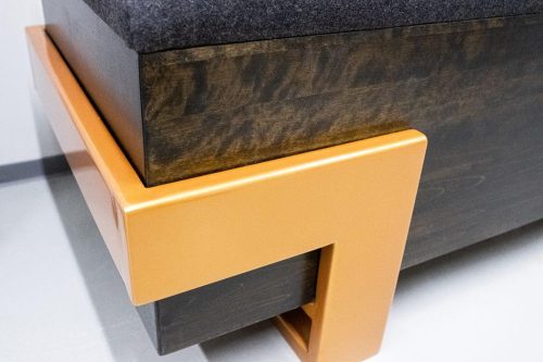 Lopputulos yhdistää teollisen tarkkuuden käsityön yksityiskohtiin: kultamaalatut teräsjalat tuovat rakenteellista lujuutta ja visuaalista näyttävyyttä, koivurunko tuo lämpöä ja luonnollista luonnetta, ja pehmustettu, palosuojatulla kankaalla verhoiltu istuin takaa mukavuuden ja kestävyyden.