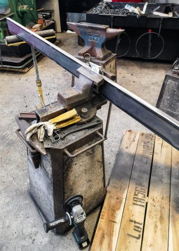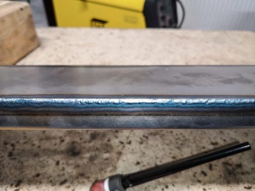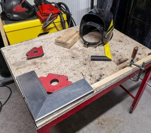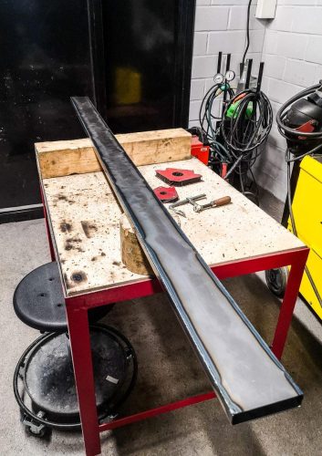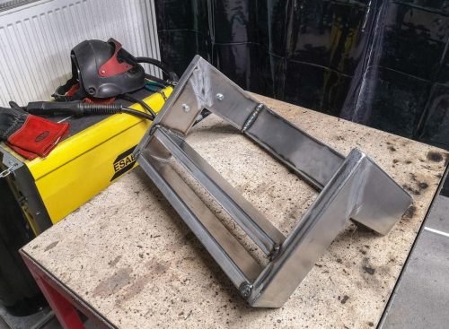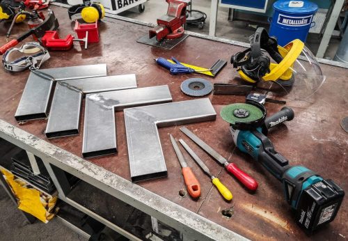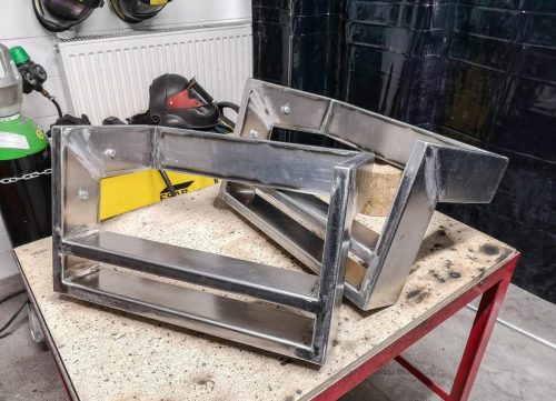Tämä oli myös ensimmäinen kerta, kun harjoiteltiin TIG-hitsausta, mikä teki vaiheesta tärkeän oppimiskokemuksen. Hitsisaumat siistittiin kulmahiomakoneella ennen kuin osat leikattiin mittaan metallivannesahalla. Reunat siistittiin, ruuviliitoksia varten porattiin reiät, ja teräselementit koottiin lopulliseksi jalkarakenteeksi MIG-hitsauksella. Hitsit viimeisteltiin hiomalla sileäksi. Maalaus toteutettiin koulun autoalan osastolla.