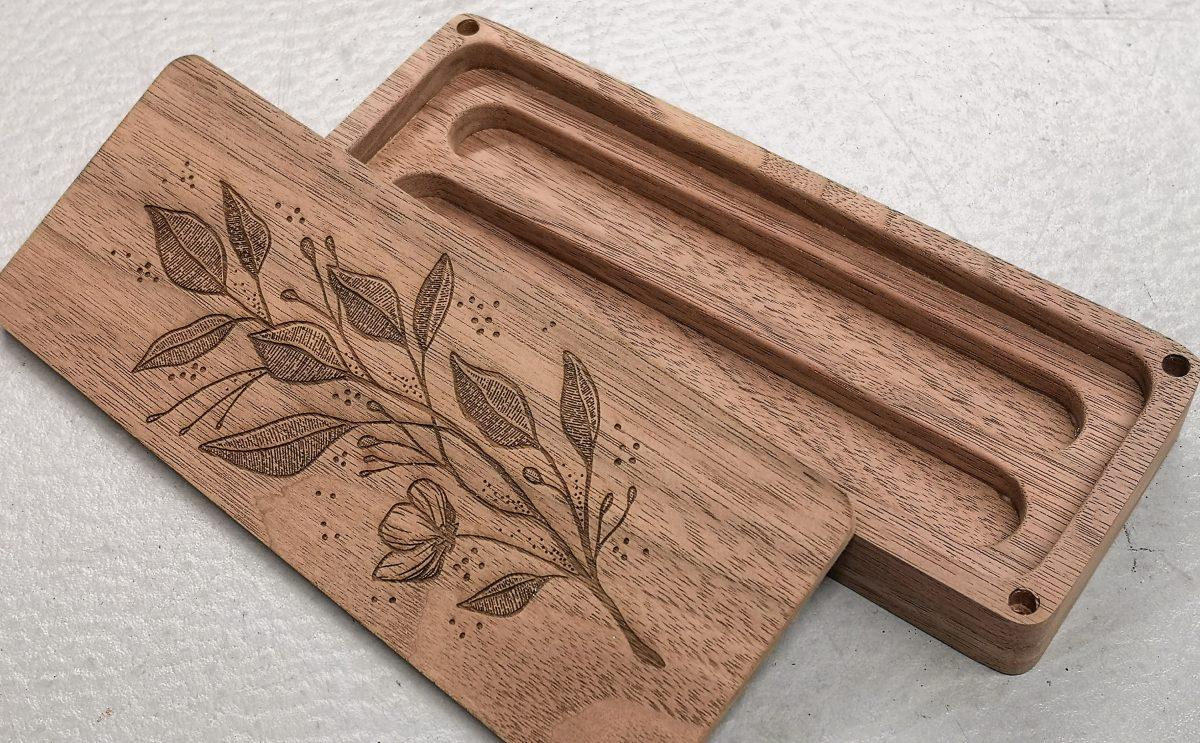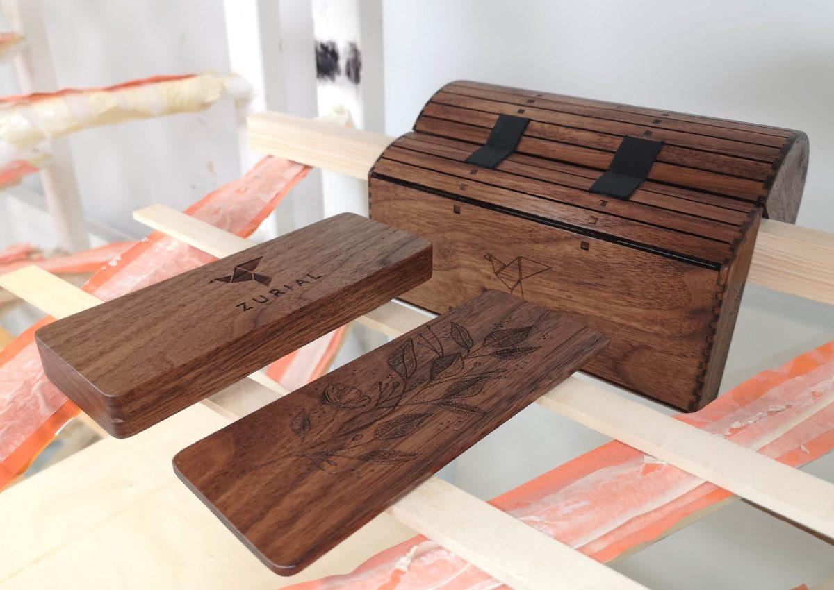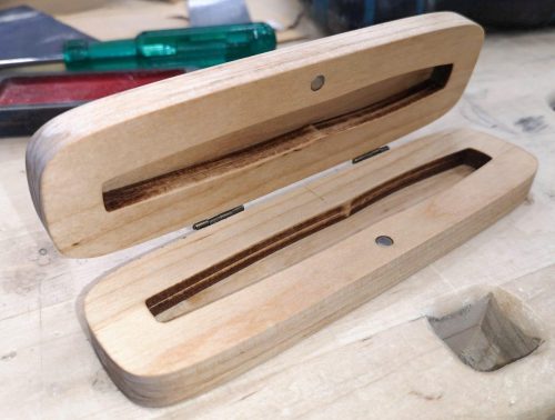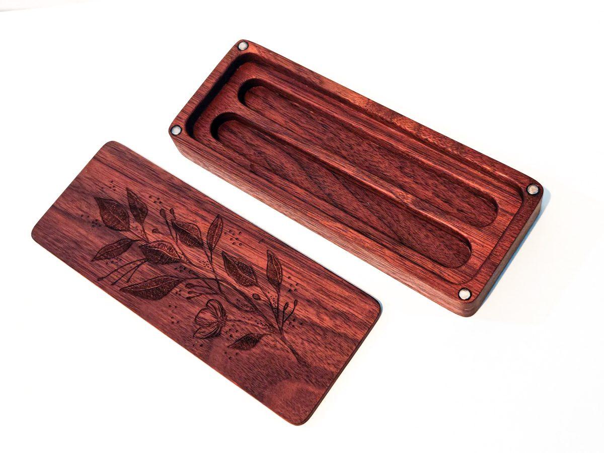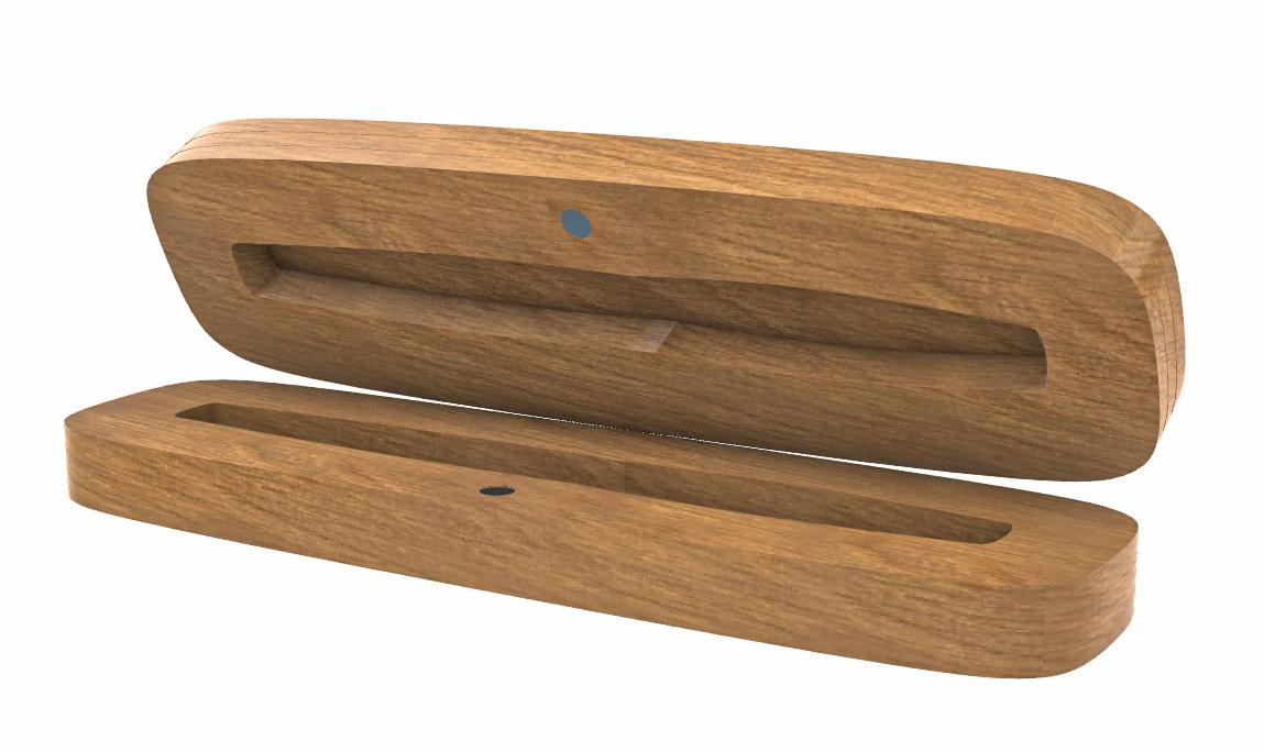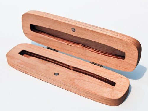 Yksi ensimmäisistä tuotteista oli koivusta tehty yksittäisen kynän kotelo. Se koottiin leikkaamalla laserilla ohuita puukerroksia, pinoamalla ne ja liimaamalla yhtenäiseksi kappaleeksi. Kaksi saranointia ja pienet magneetit pitivät kannen tukevasti kiinni. Kanteen kaiversin syvän kukkakoristeen, joka loi reliefimäisen ilmeen.