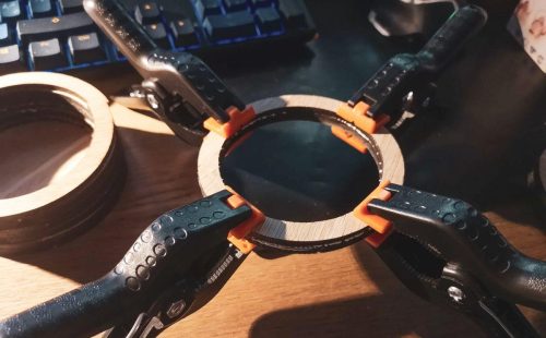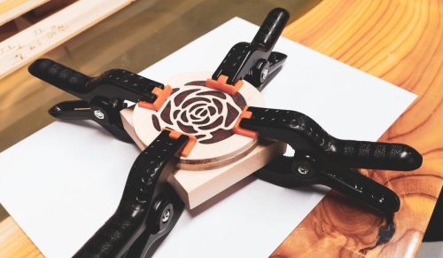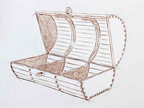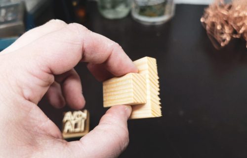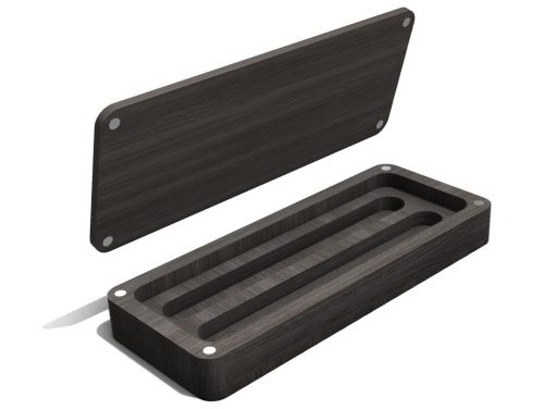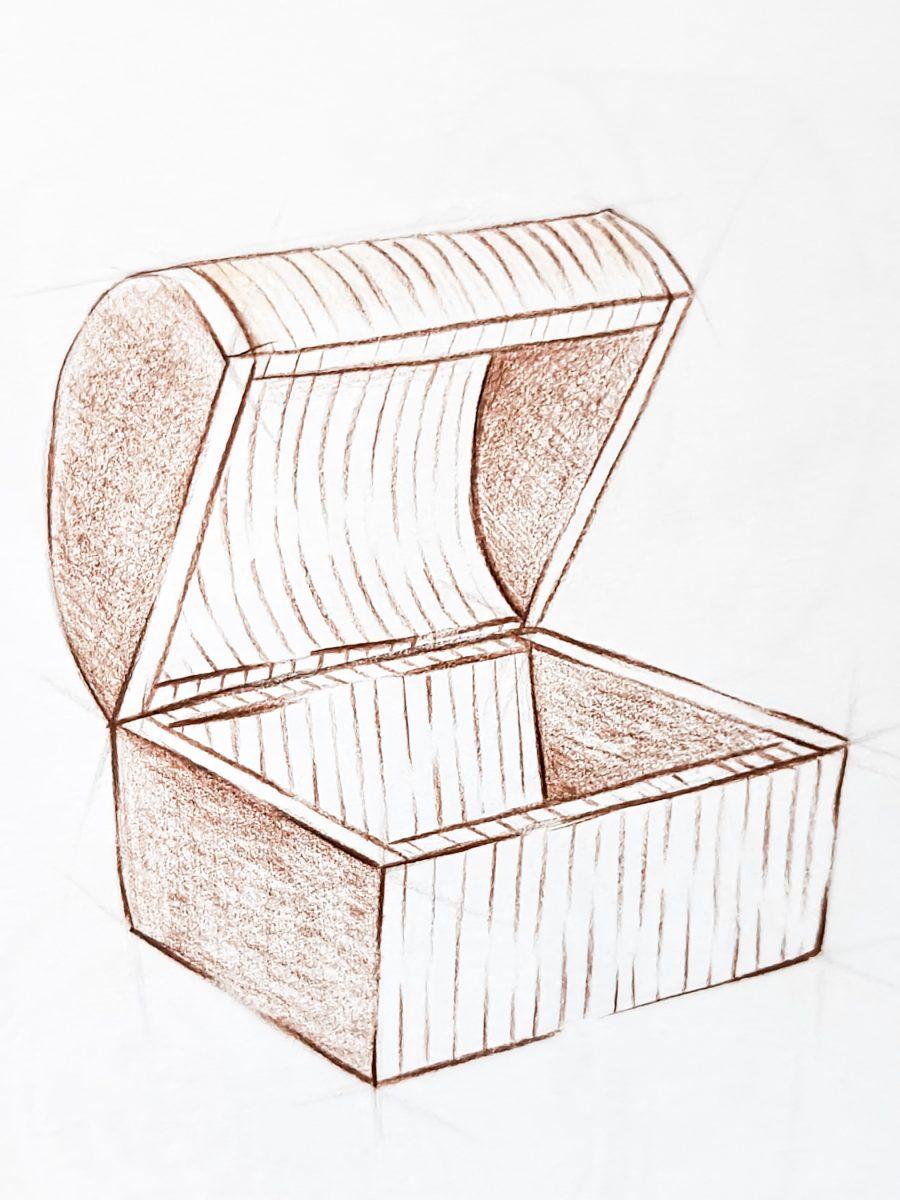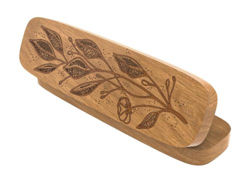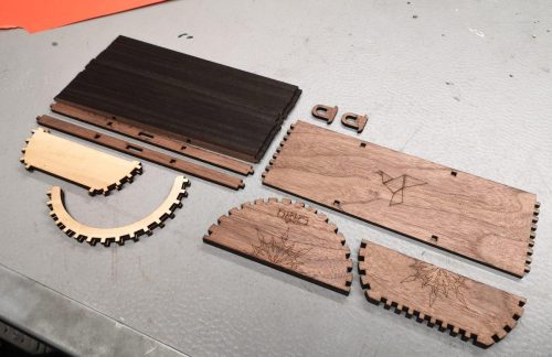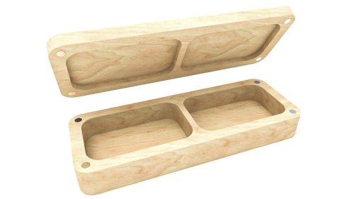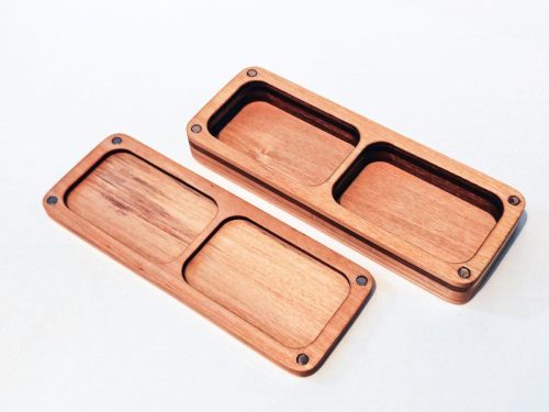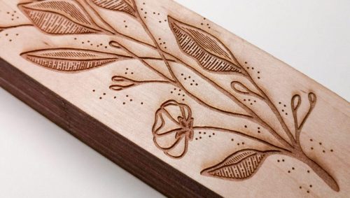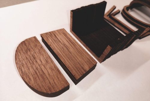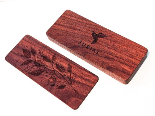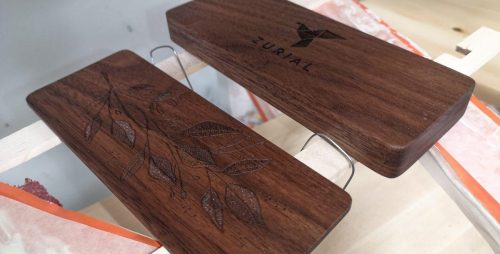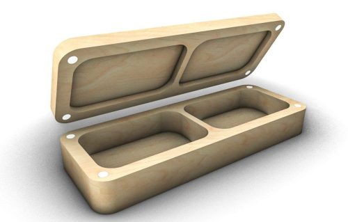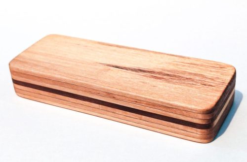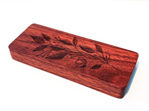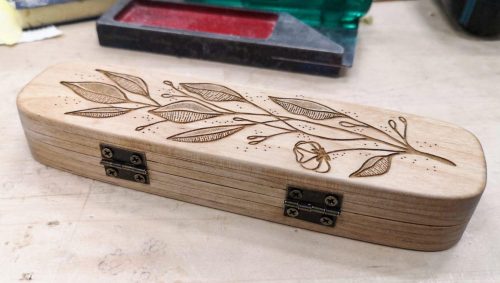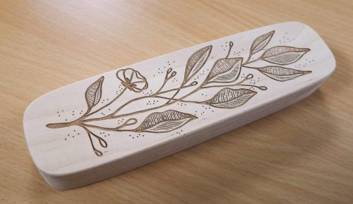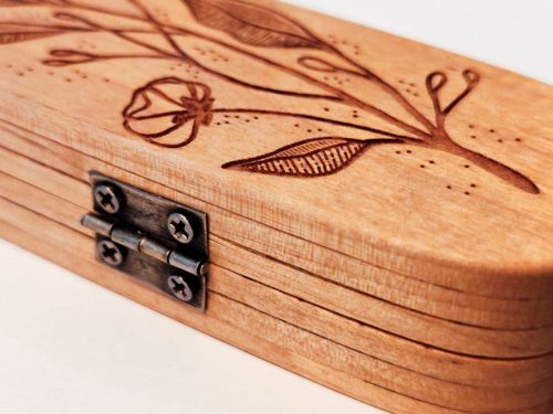 Yksi ensimmäisistä tuotteista oli koivusta tehty yksittäisen kynän kotelo. Se koottiin leikkaamalla laserilla ohuita puukerroksia, pinoamalla ne ja liimaamalla yhtenäiseksi kappaleeksi. Kaksi saranointia ja pienet magneetit pitivät kannen tukevasti kiinni. Kanteen kaiversin syvän kukkakoristeen, joka loi reliefimäisen ilmeen.