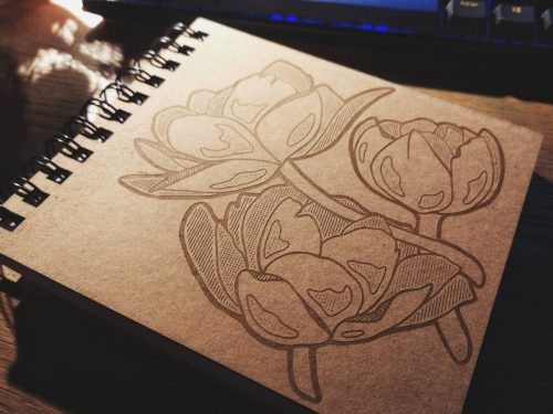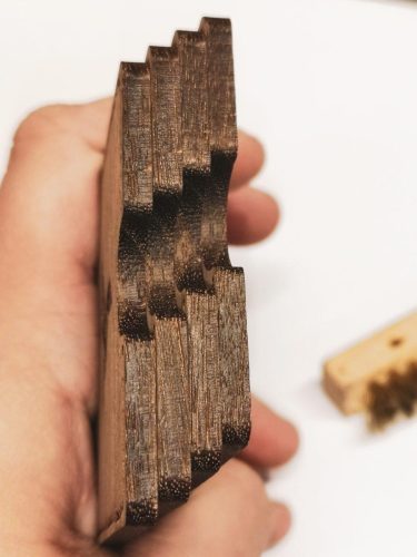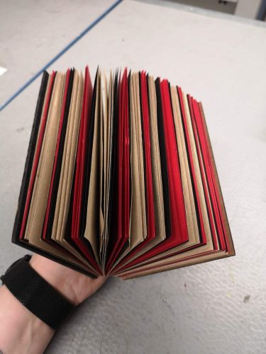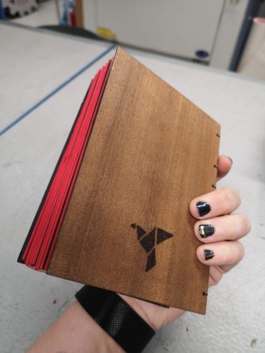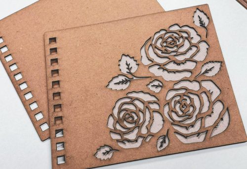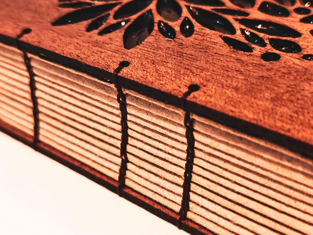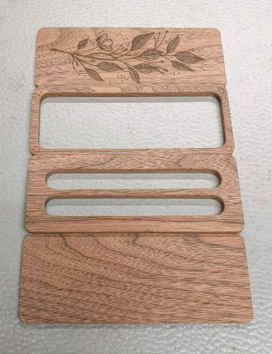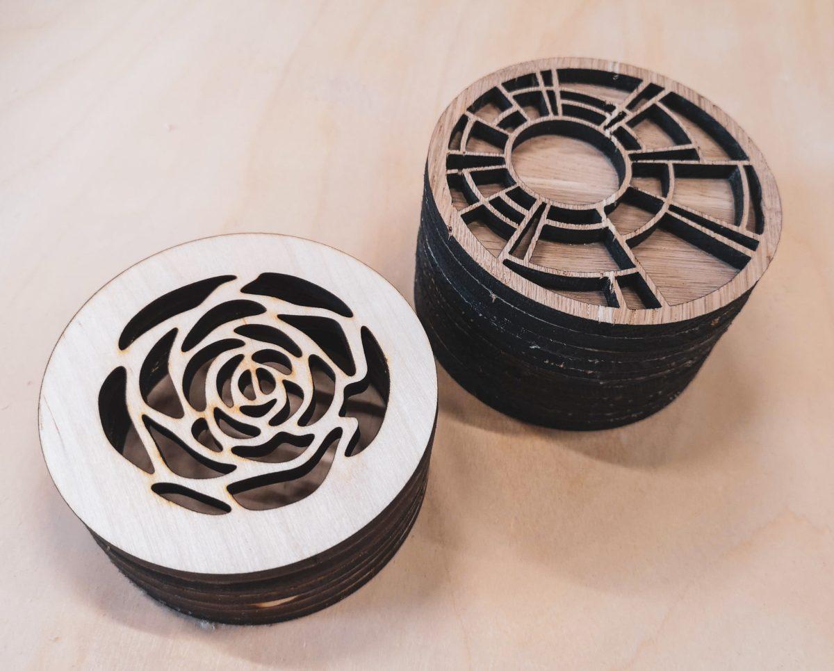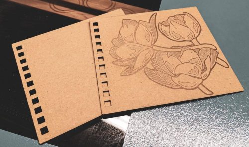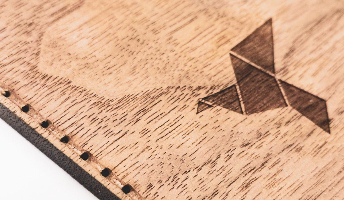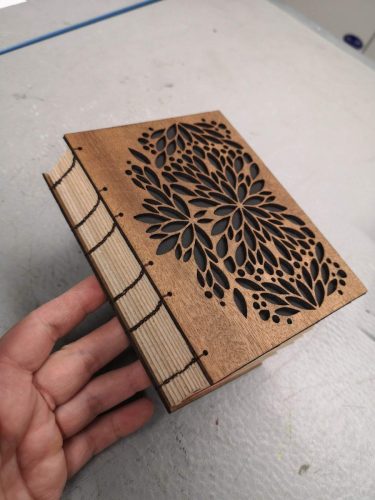Käytin laseria myös tasopinnoille: valmistin luonnoskirjan kansia pahvista ja saksanpähkinästä, joihin leikkasin ja kaiversin koristekuvioita. Työt osoittivat, että laser soveltuu sekä rakenteiden tekemiseen että pintasuunnitteluun.