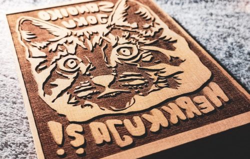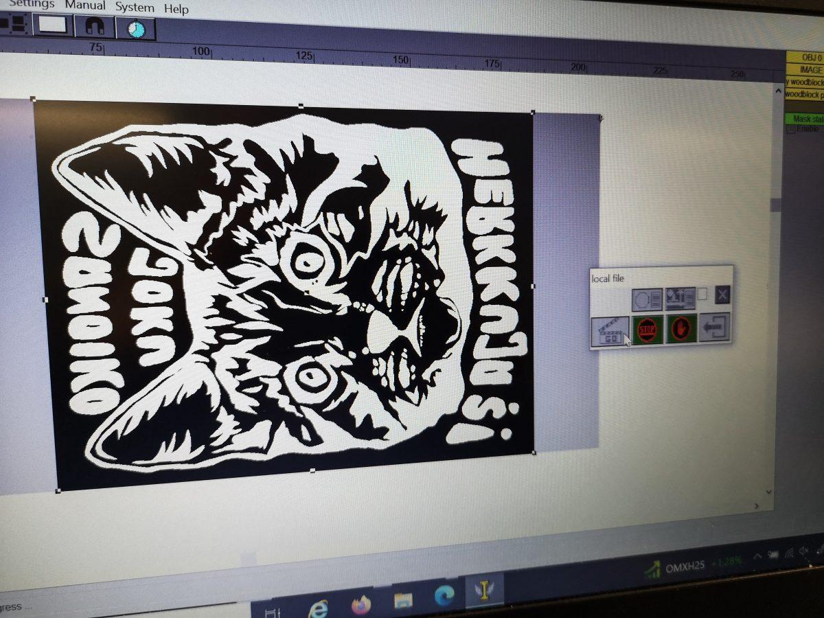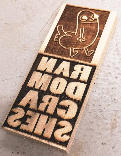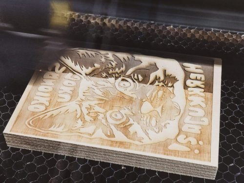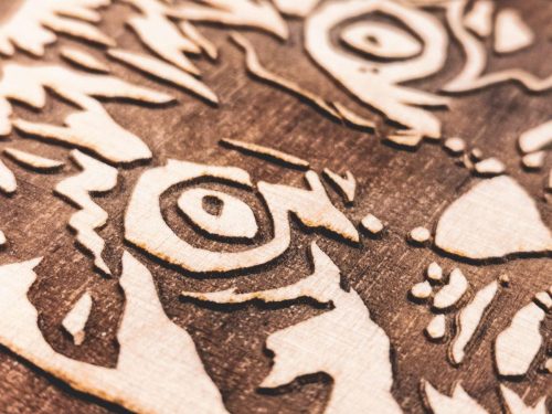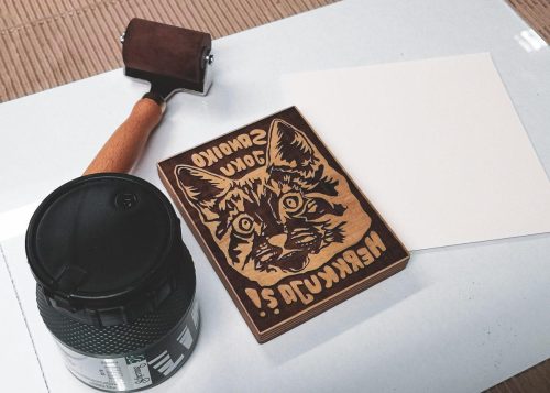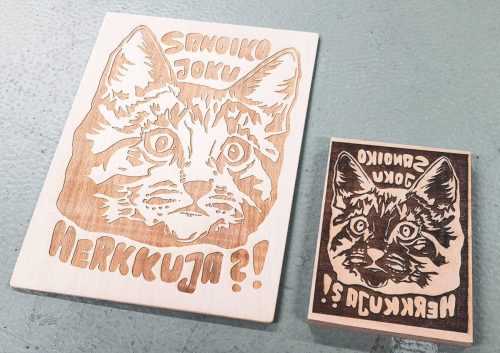 Lopuksi tein laserilla puupainolaattoja grafiikkaa varten. Peilasin suunnitelmani ja kaiverrutin ne syvälle puuhun, jolloin syntyi kohopintoja. Laatkoja voitiin mustettaa tai maalata ja käyttää leimasimina tai perinteisessä puupainannassa. Harjoitus osoitti, miten digitaalinen suunnittelu ja laserkaiverrus taipuvat taidegrafiikan tekniikoihin.