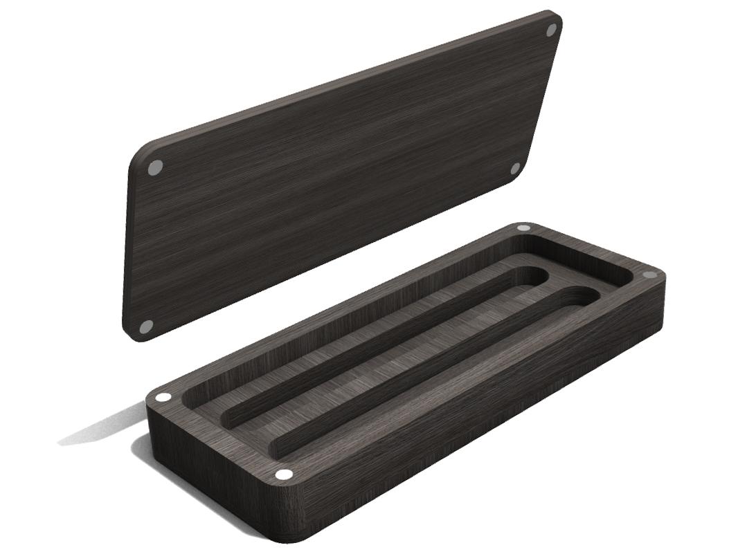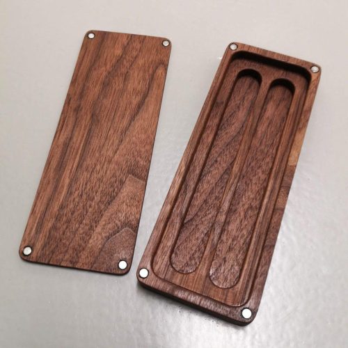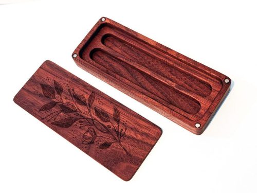 Toinen versio valmistui saksanpähkinästä ja mitoitin sen kahdelle kynälle. Rakenne oli sama kerrosperiaate, mutta saranoiden sijaan kansi kiinnittyi kaikissa kulmissa olevien magneettien avulla. Kanteen kaiversin vastaavan kukkakuvion ja pohjaan logoni.