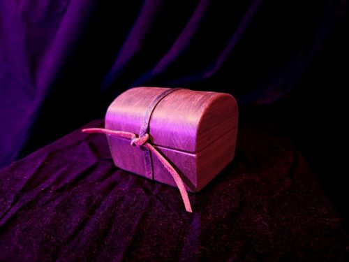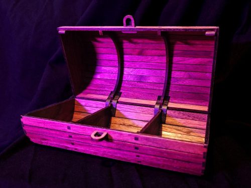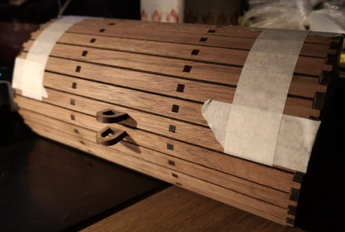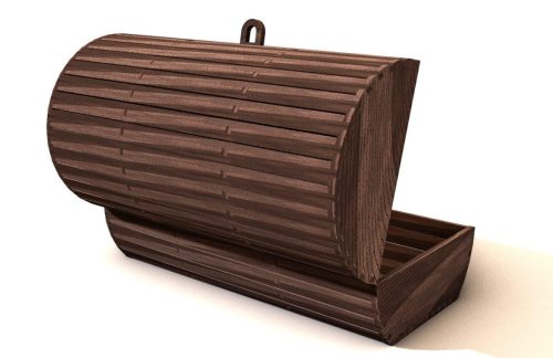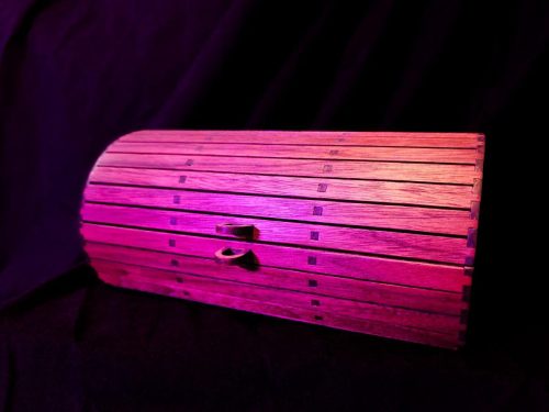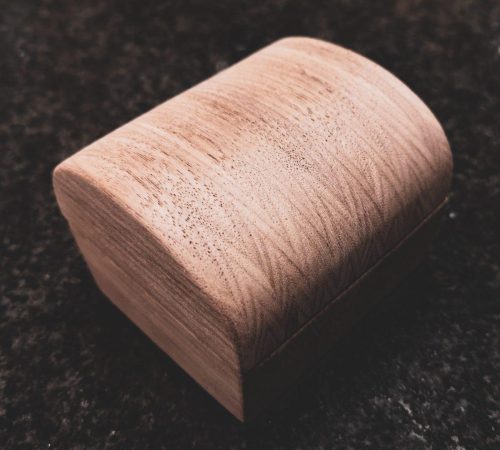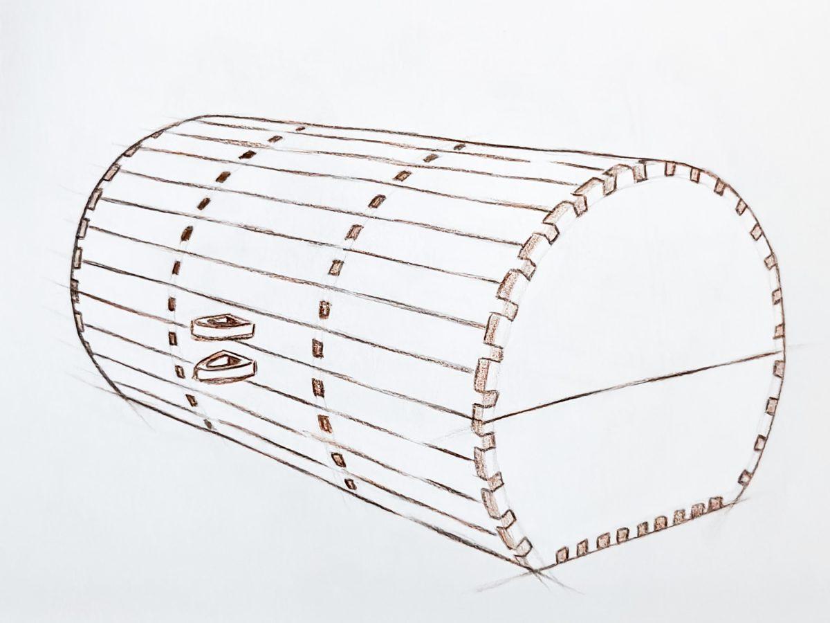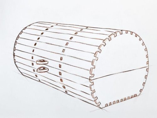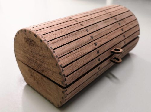 Kokeellinen pikkuteos oli myös tynnyrimäinen aarrelaatikko, joka koottiin laserleikatuista ohuista puukerroksista. Metalliosien sijaan käytin nahkahihnoja saranoina, jolloin rasia pysyi kevyenä ja joustavana ja sai rustiikkisen ilmeen.