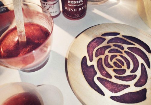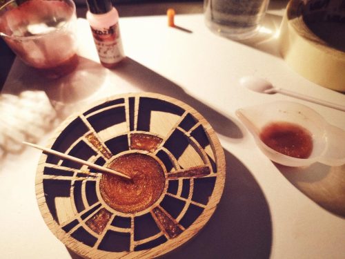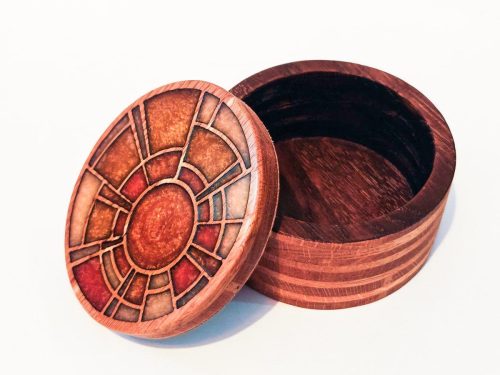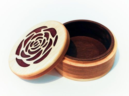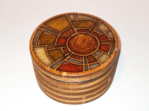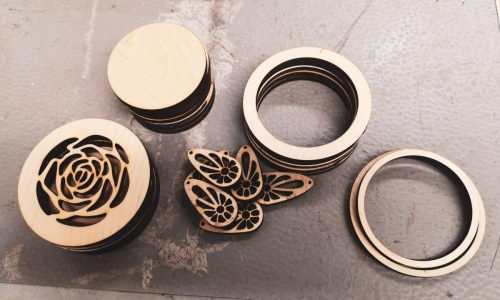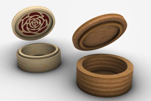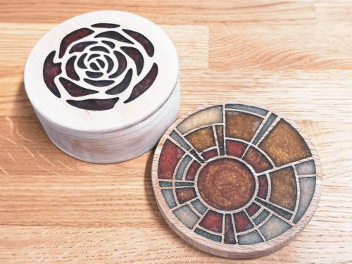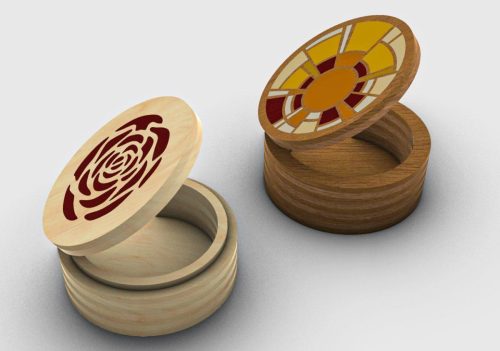 Suunnittelin useita koruille tarkoitettuja rasioita. Yksi oli lehden muotoinen rasia, joka toteutettiin pinoamalla laserleikattuja koivukerroksia luonnonmuotoja mukaillen. Kaksi pyöreää rasiaa, toinen koivusta ja toinen tammesta, tehtiin samalla kerrosmenetelmällä, mutta kansissa oli eroa: kumpaankin leikattiin aukkoja, jotka täytin myöhemmin hartsilla, värjättynä kiillejauheilla ja musteväreillä. Näin syntyi lasimaalausta muistuttava, puun kanssa läpikuultavasti väreilevä kontrasti.