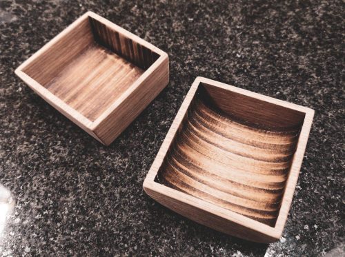 Lisävariaatiossa suunnittelin kaksi pientä lokeroa sekalaisille pikkutavaroille. Koristelu pidettiin minimaalisena; pohjaan kaiverrettiin toiminimeni.