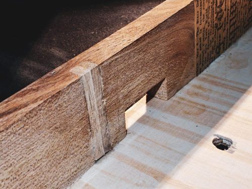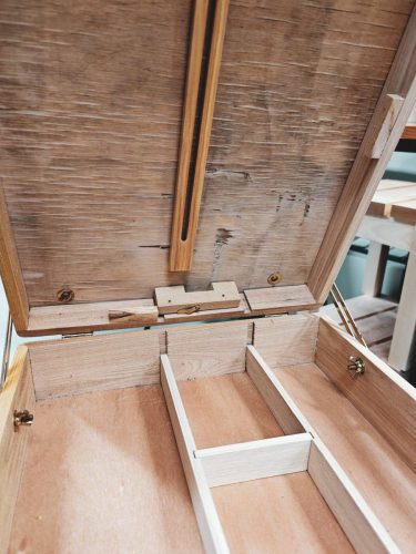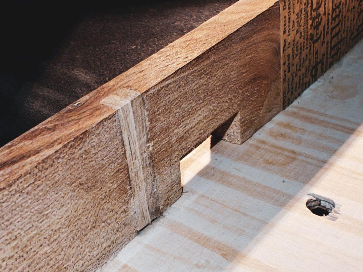 Toinen keskeinen korjaus koski kankaan kannatinlistaa. Siihen oli alkanut tulla murtumia, ja se olisi lopulta katkennut painon alla. Vaihdon sijaan vahvistin listaa liimaamalla sen päälle ohuen puusäleen, jolloin alkuperäinen osa voitiin säilyttää.