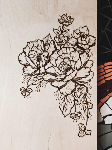 Tärkein korjauskohde oli laatikon etuseinä, joka kannattelee maalauskangasta. Leikkasin ohuesta vanerista uuden levyn, sovitin sen huolellisesti kehykseen ja liimasin viereisiin seiniin. Jotta osa sulautuisi kokonaisuuteen, poltin pintaan polttokynällä kukkakoristeen. Polttokaiverrus antoi henkilökohtaisen ilmeen ilman että se tuntui vieraalta.