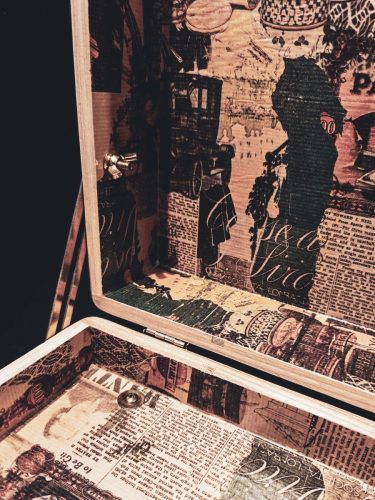Telineen sisältä poistettiin asiakkaan toiveesta vanhat väliseinät, jotta sisään mahtuu kankaita tai suuria luonnoskirjoja. Puinen sisäpinta oli pahoin kulunut, eikä näyttänyt hionnankaan jälkeen edustavalta. Parantaakseni ulkonäköä vuorasin sisätilan koristepaperilla, kiinnitin sen PVAC-liimalla ja suojasin lakkakerroksella. Näin sisäosasta tuli siisti ja miellyttävä käyttää.